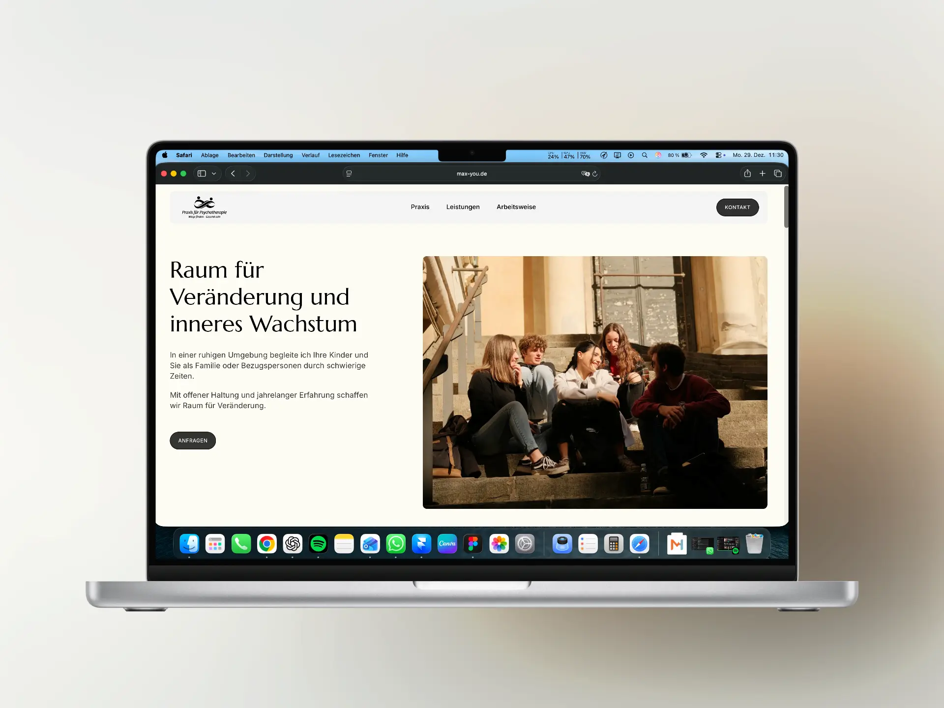 Für Psychotherapie Max You habe ich einen klar strukturierten und einfühlsamen Webauftritt entwickelt, der Vertrauen schafft und Orientierung gibt. Ziel war es, die therapeutische Haltung sichtbar zu machen und Menschen bereits beim ersten Besuch ein sicheres Gefühl zu vermitteln.